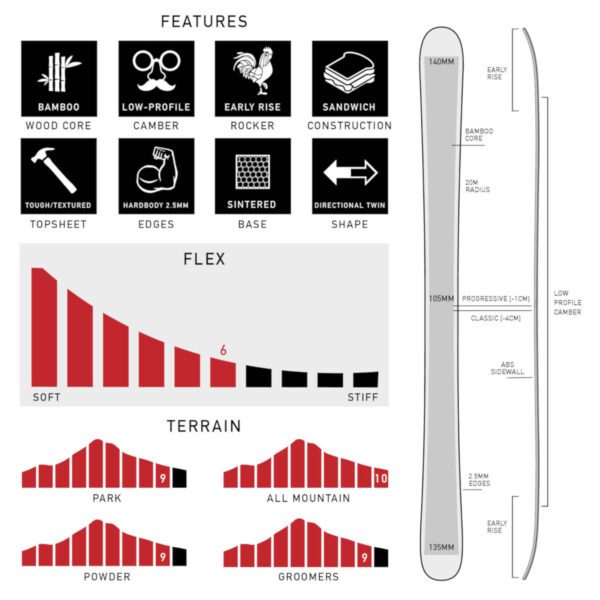 Skidan har en poppelträ-kärna, 2.5 mm stålkanter och en hållbar toppskikt. Lågprofilkamber + hybrid early rise form gör snabba rörelser och mångsidig åkning möjlig.