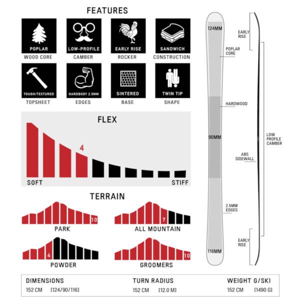 Suksi kätkee sisälleen poppeli puuytimen, paksut 2.5mm kantit ja vahvistettua puuta siteiden alla. Karhennettu pintalaminaatti on selvästi kestävämpi verrattuna perinteiseen laminaattiin. Matalaprofiilinen camberi antaa hyvän tuntuman kantilla laskemiseen, vaikka olisikin jäistä.