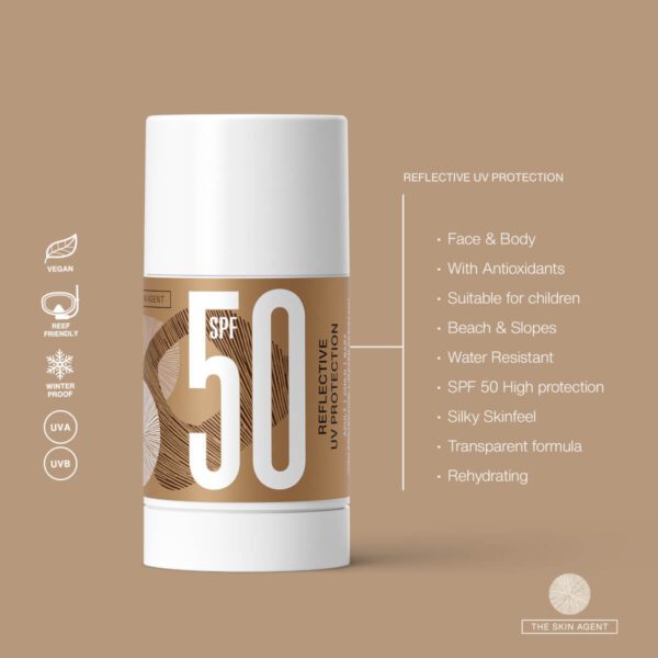 Erittäin heijastava aurinkosuoja, joka tarjoaa täydellisen suojan UVA/UVB-säteilyn ja vapaiden radikaalien heikentäviä vaikutuksia vastaan. Vedenkestävä. Tuote on täysin vedetön, joten se sopii erinomaisesti käytettäväksi niin laskettelurinteessä kuin rannallakin.
